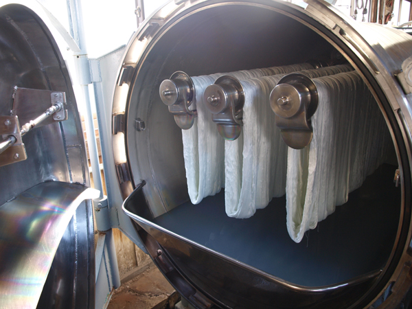 タテ糸を圧力釜へタテ糸を整経(次ページ参照)するという都合上、タテ糸とヨコ糸を分けて染色します。こちらの染色工場は従業員4名という小さな工場ですが、あくなき品質の向上により厳しい競争を勝ち抜いてきました。染色は色むらや糸の切断など品質に最も気を使わなければならない大事な工程です。 |